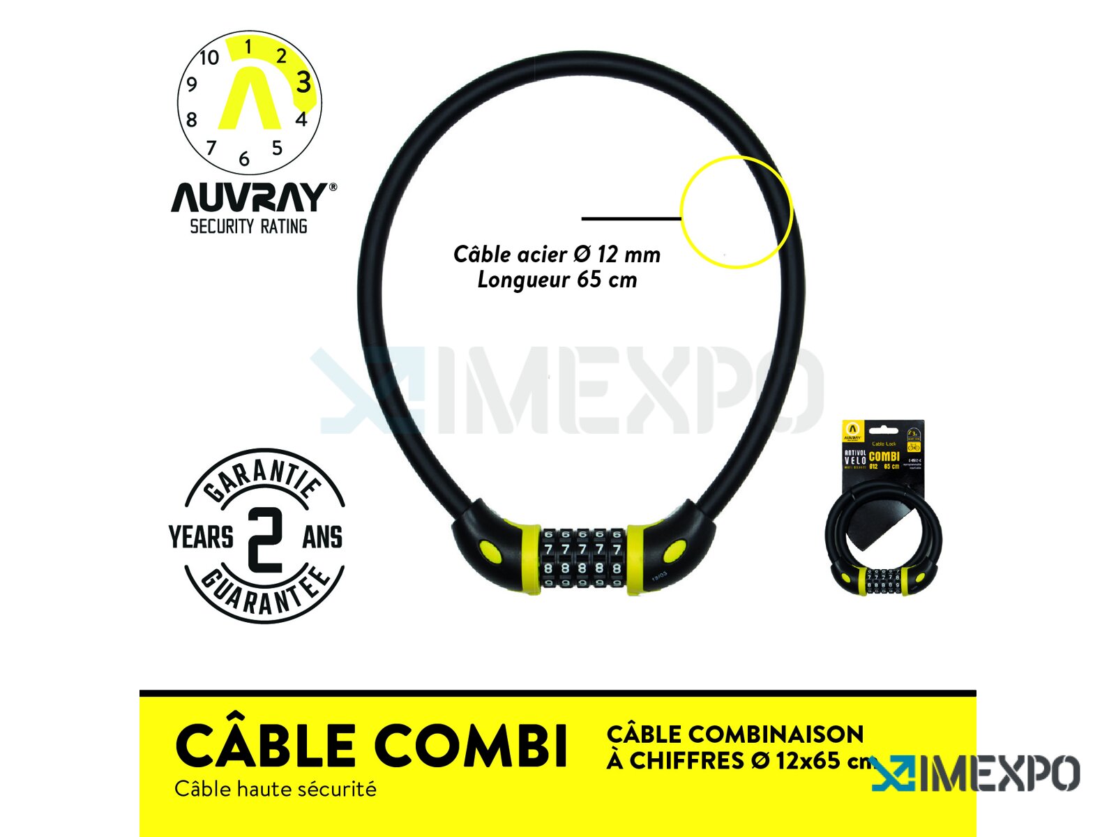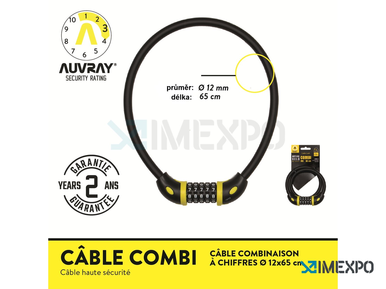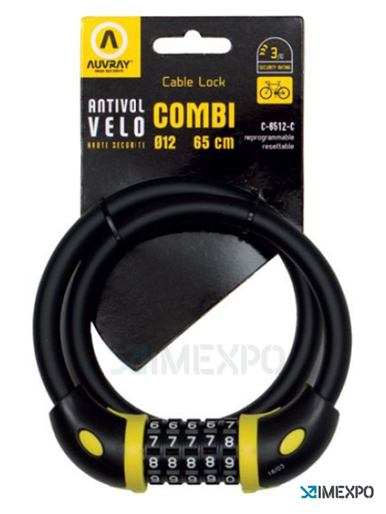 Auvray zámek kabel Cable Combi 65cm 12mm kód je spolehlivým zabezpečením pro vaše cennosti. Tento zámek disponuje kvalitním kabelem o průměru 12 mm a délce 65 cm, což zajišťuje dostatečnou flexibilitu a pevnost.